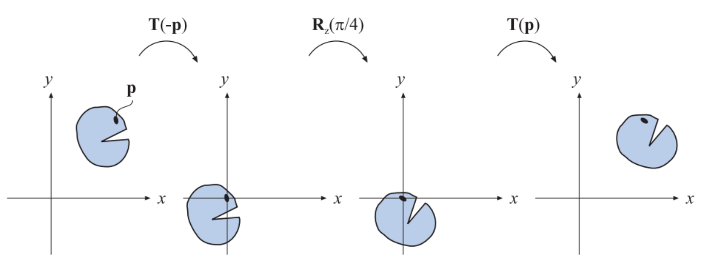 To rotate around a point p we have to: translate p to origin, rotate, translate back to p